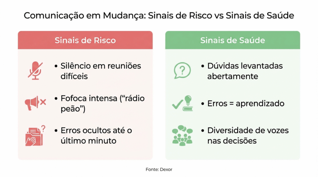 Mas a realidade é bem diferente. Aquele silêncio não era concordância; era o som do medo. Naquele momento, o grupo “congelou”. Dúvidas cruciais foram engolidas e riscos óbvios foram ignorados. É nesse exato ponto que a gestão de mudança falha — não por falta de estratégia técnica, mas por falta de segurança psicológica.